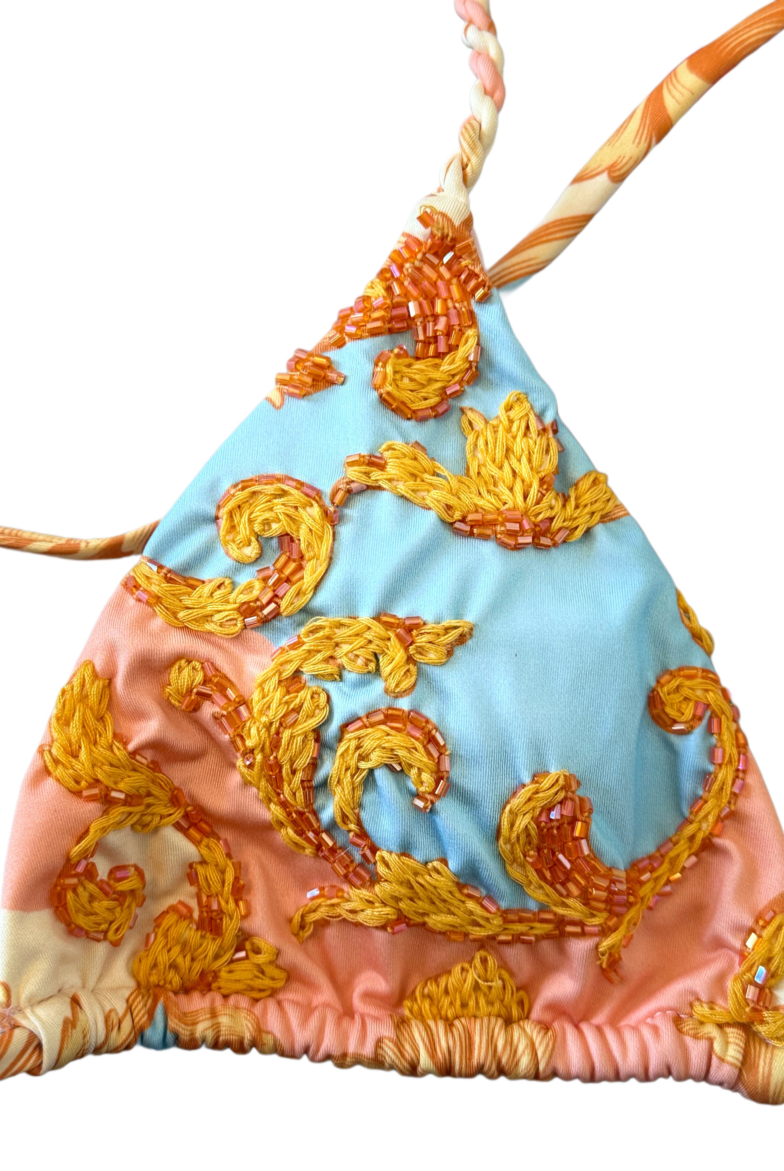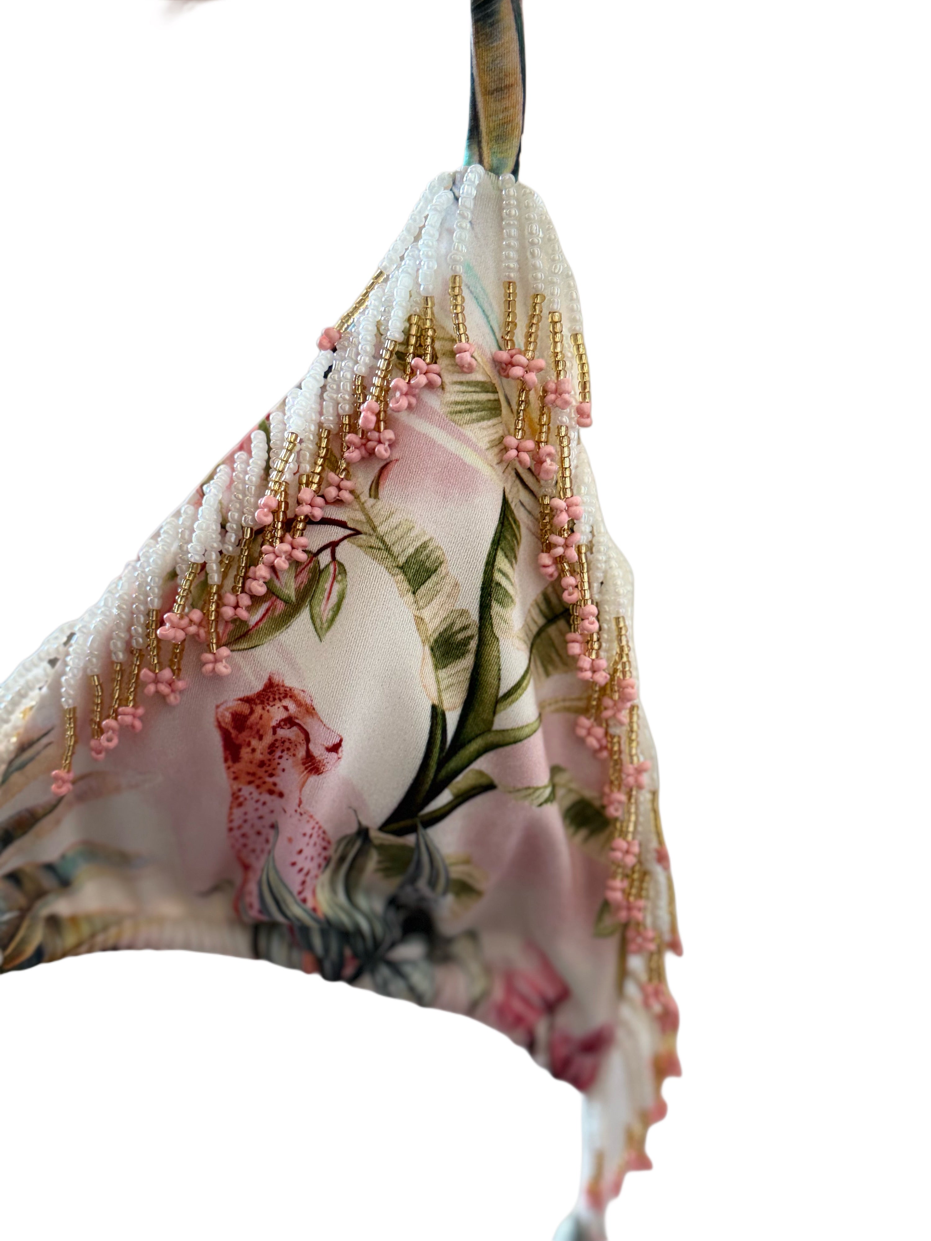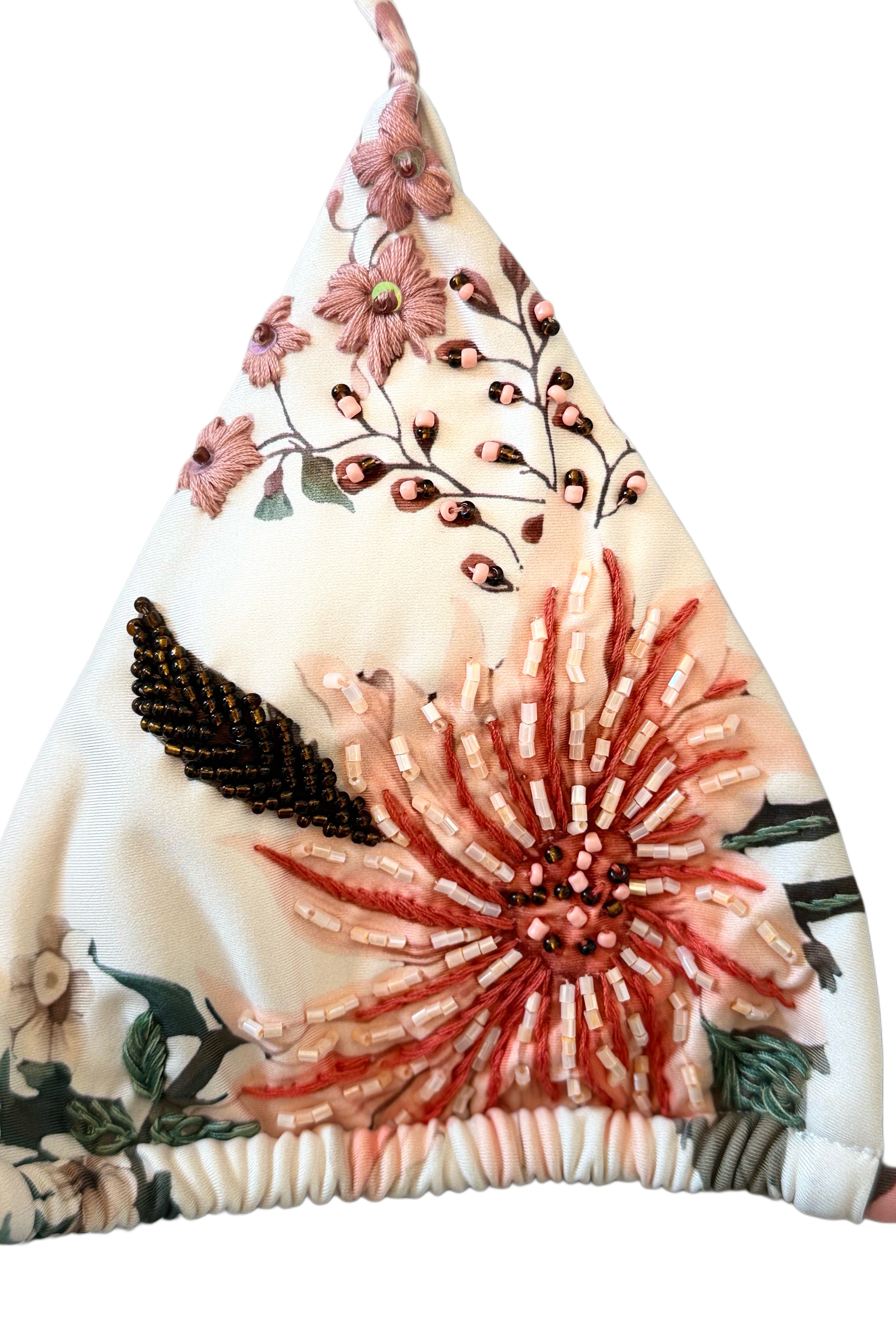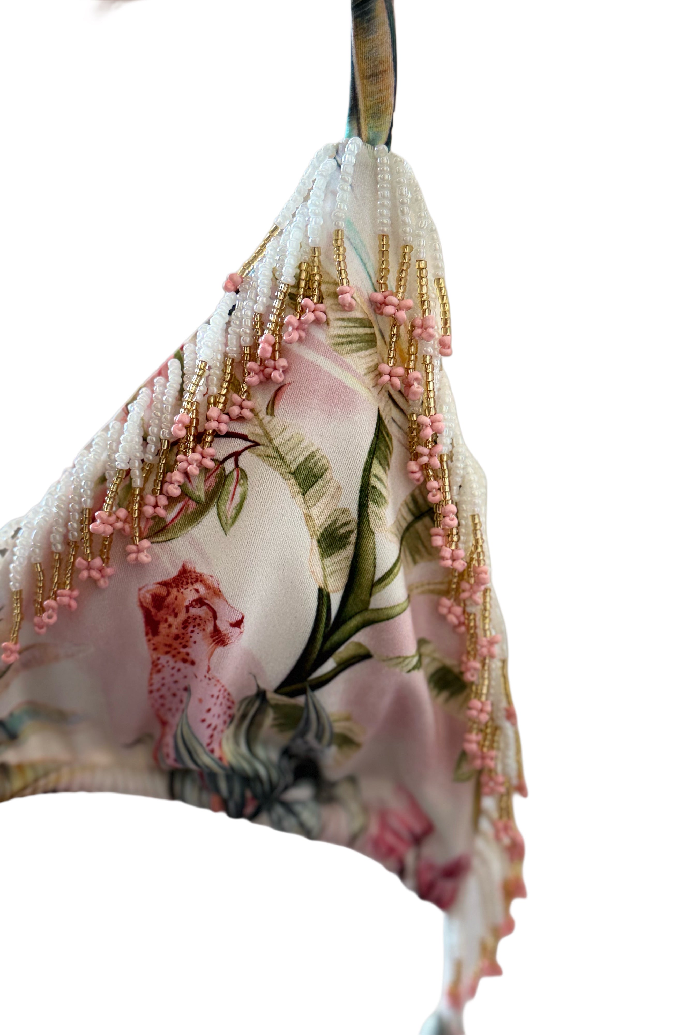 The Diana Bikini Set, is fully embellished with handcrafted beading for a luxurious, artisanal feel. The adjustable triangle slider top ensures a perfect fit; the bottom features side ties.