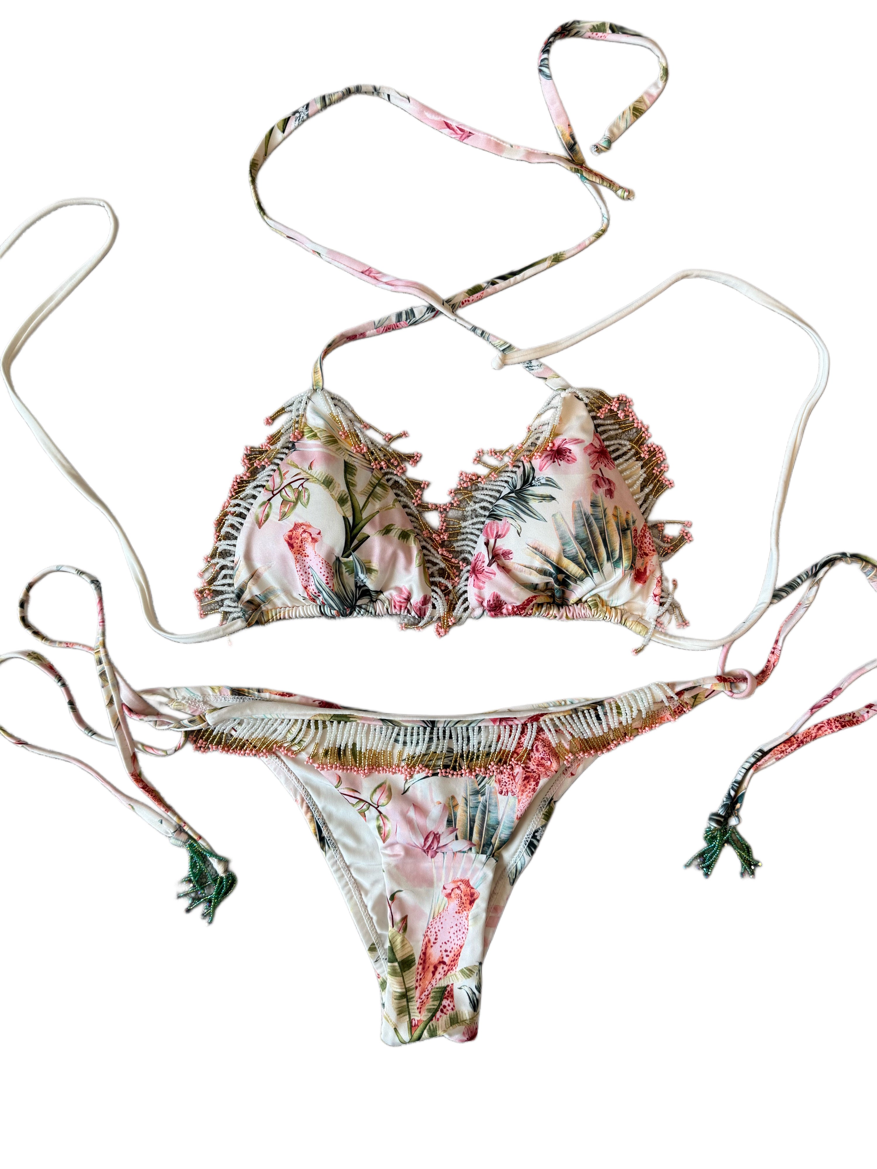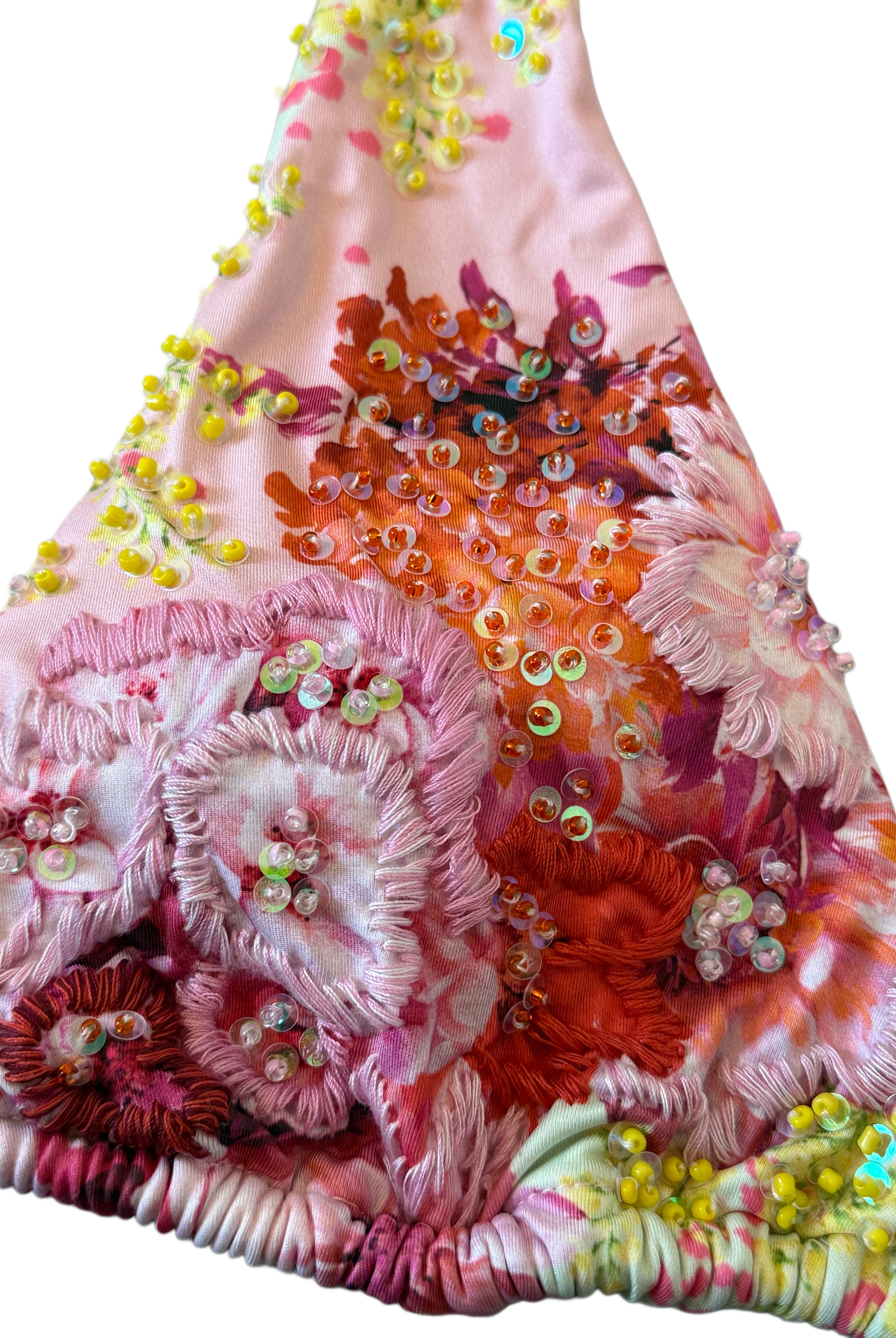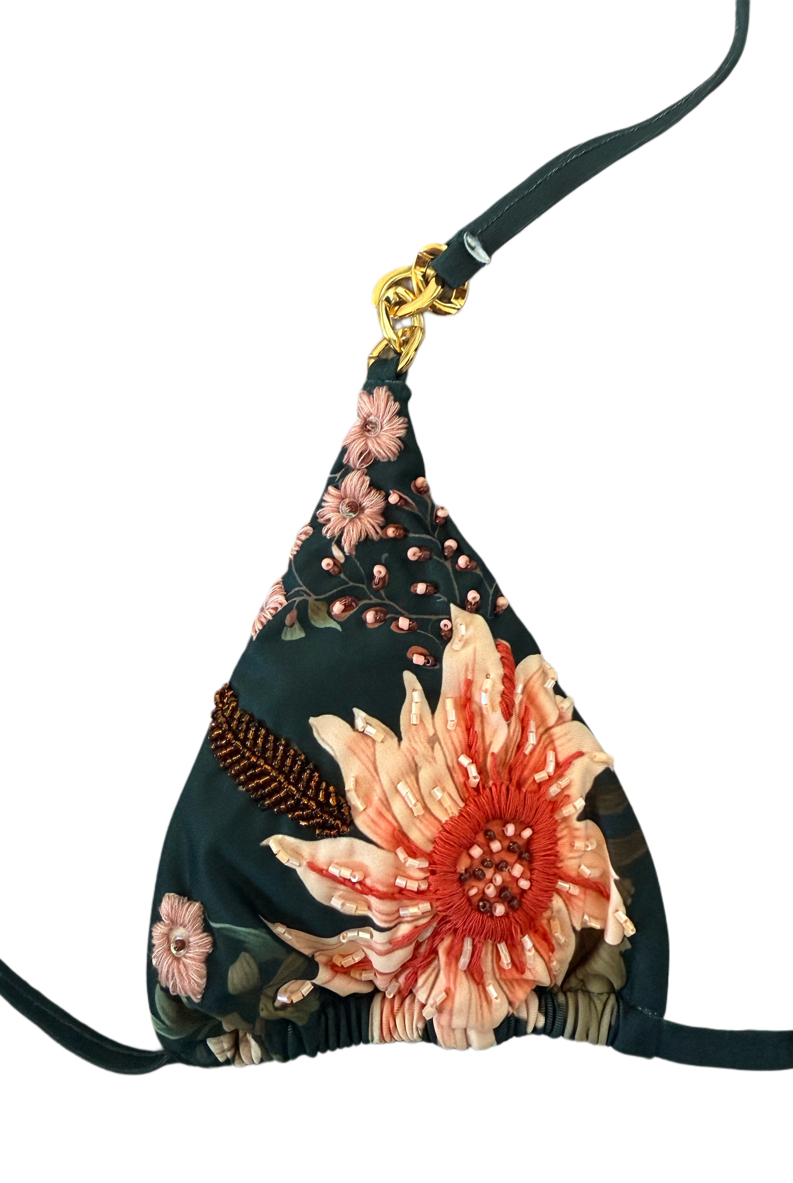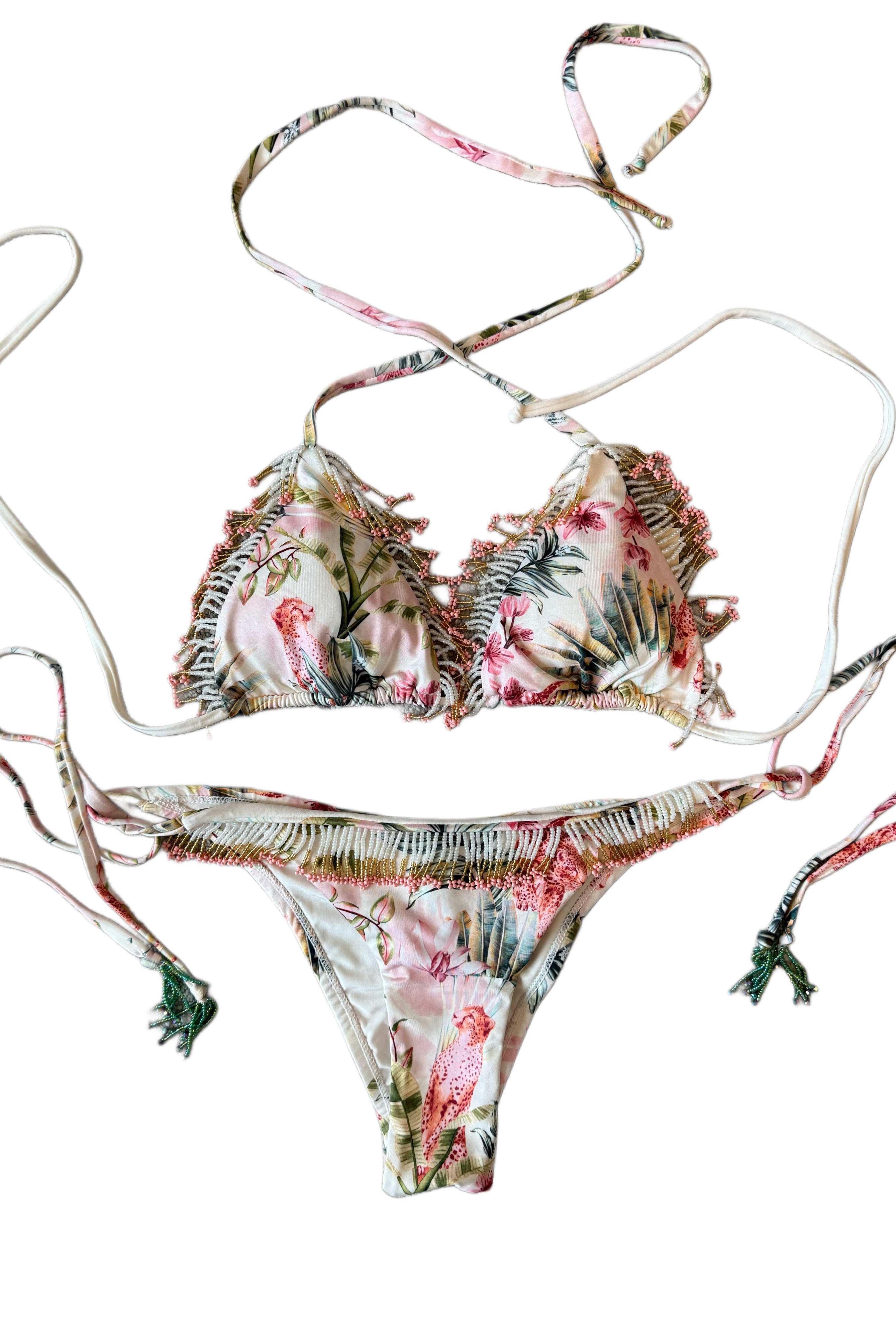 The Diana Bikini Set, is fully embellished with handcrafted beading for a luxurious, artisanal feel. The adjustable triangle slider top ensures a perfect fit; the bottom features side ties.