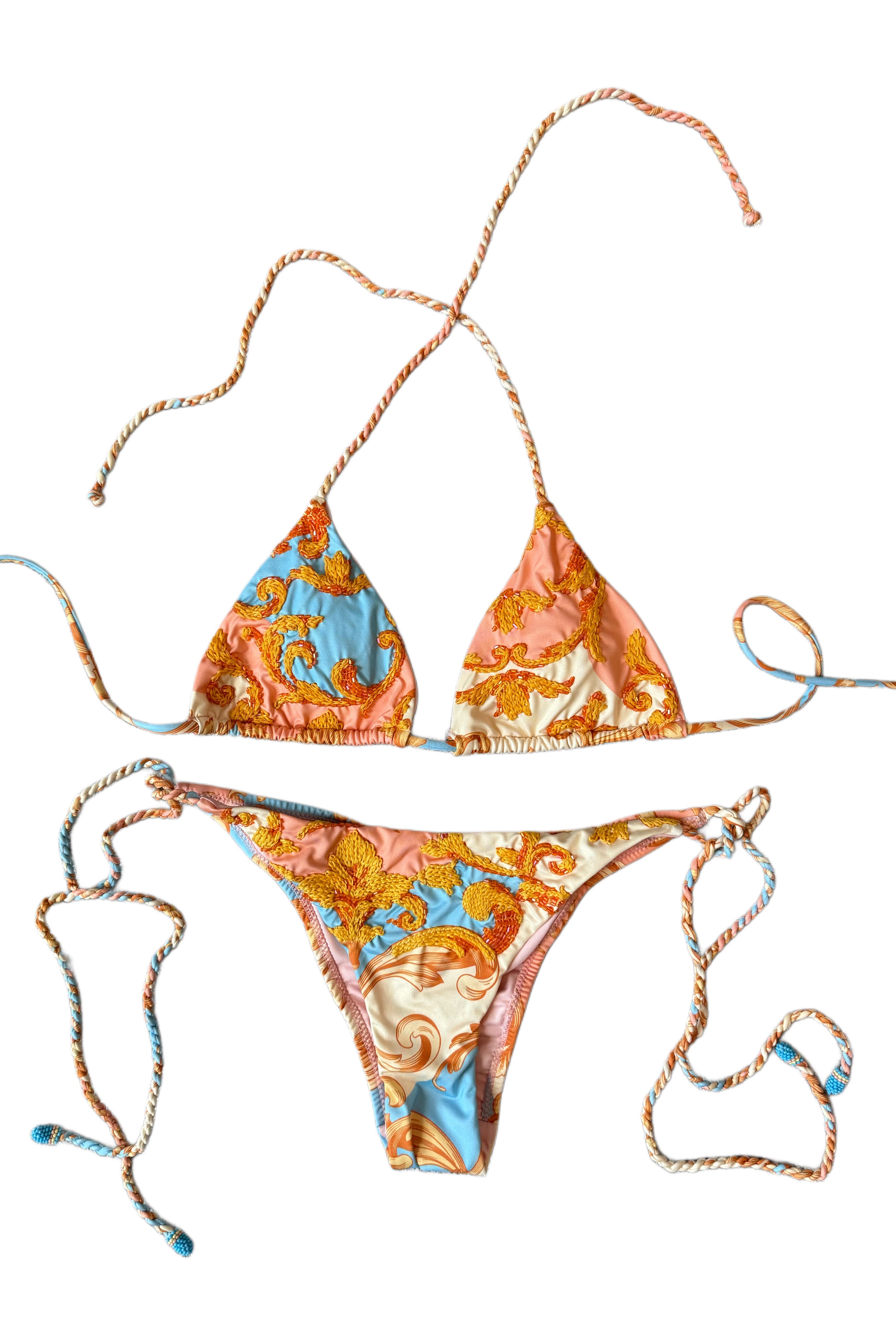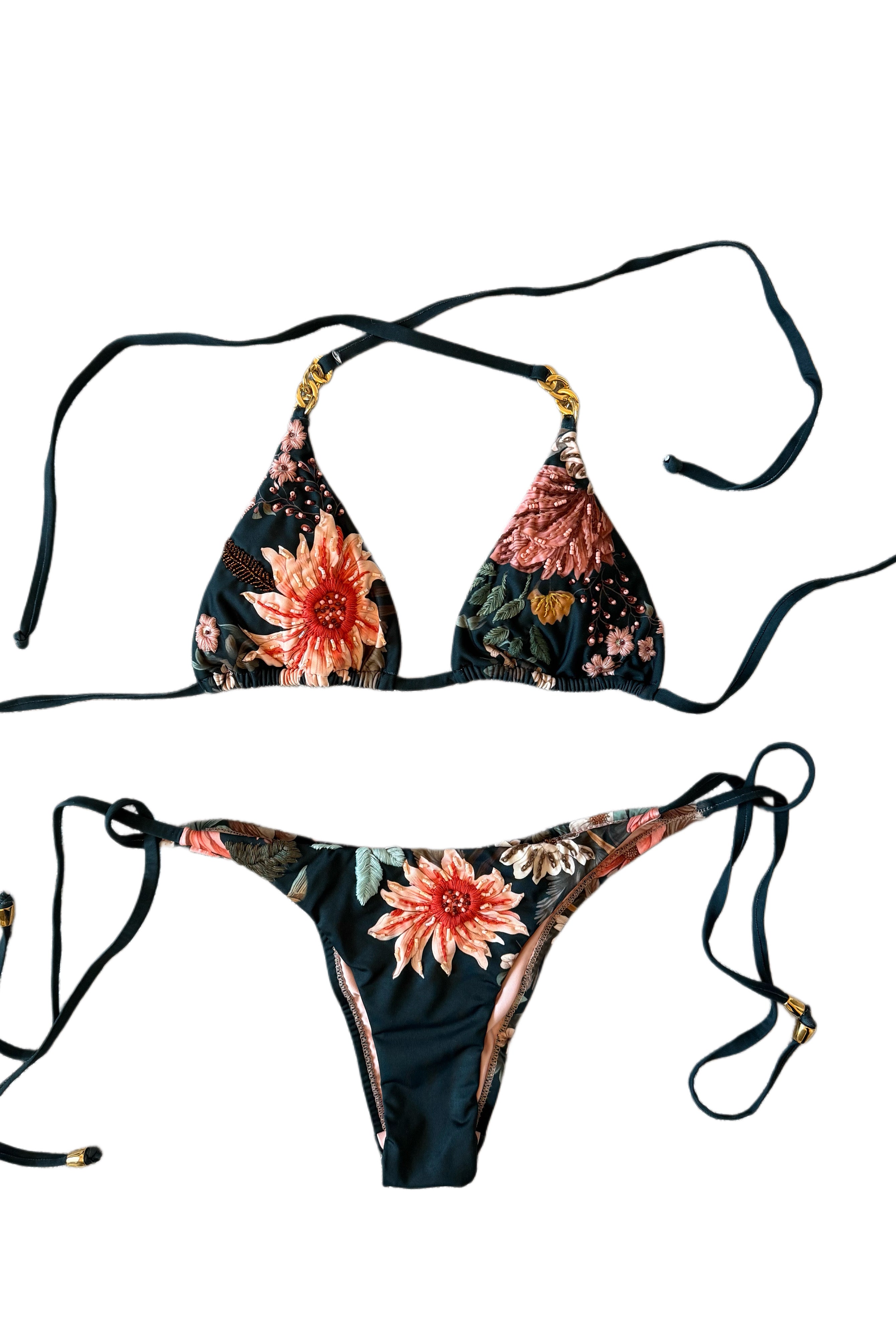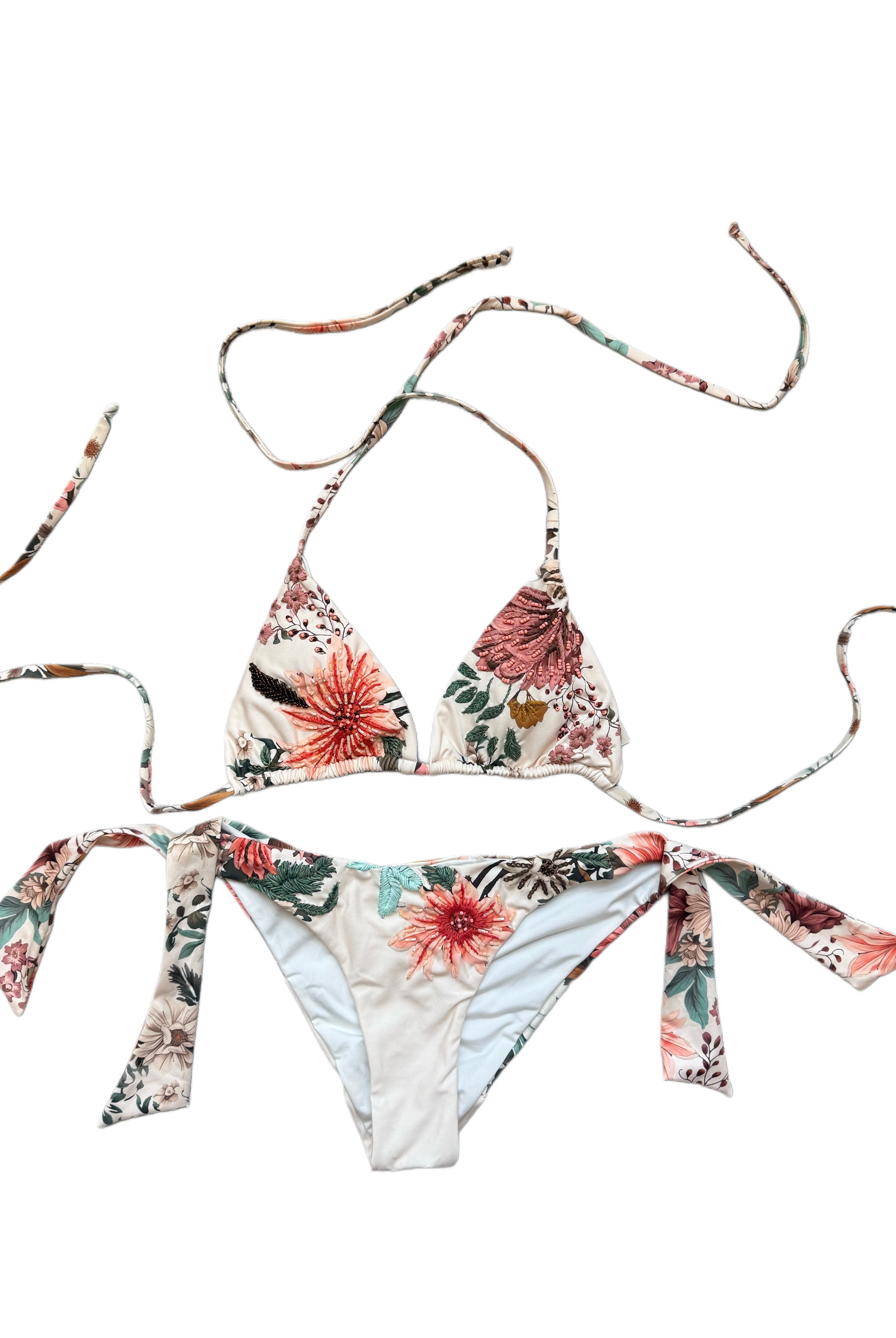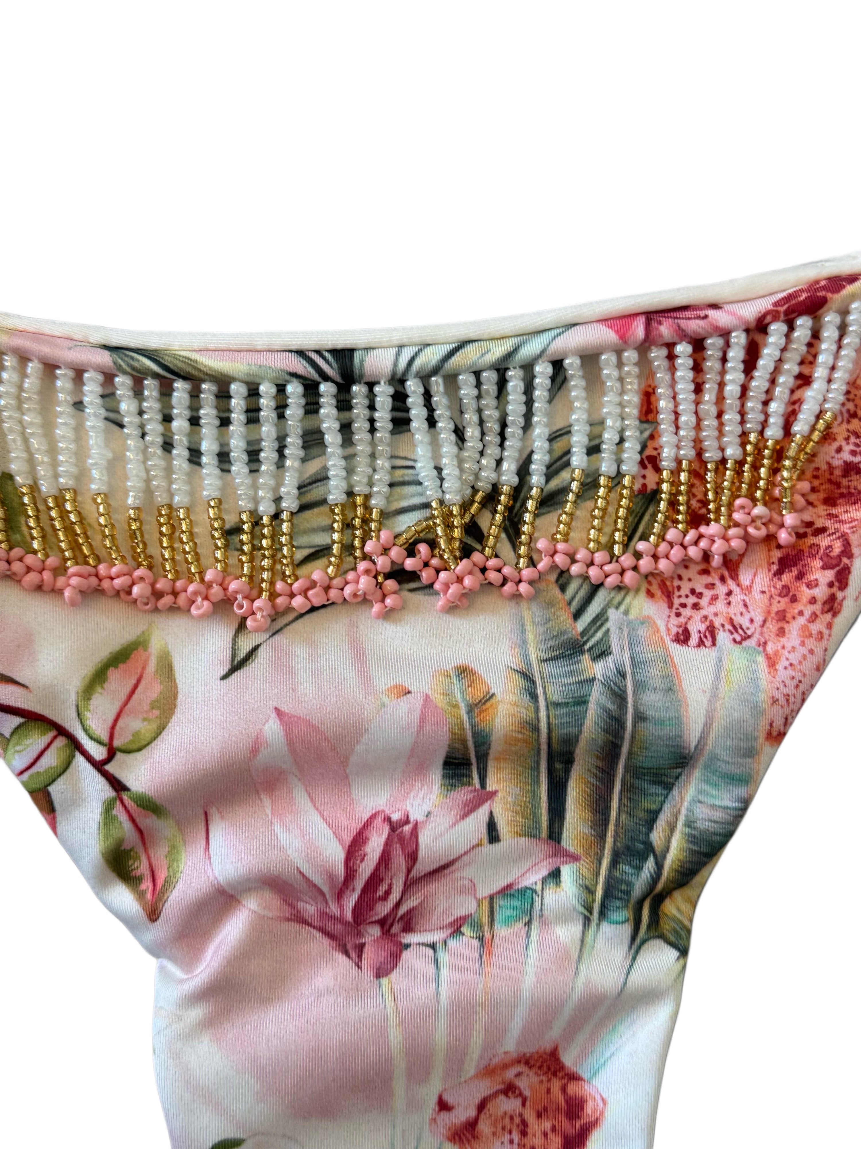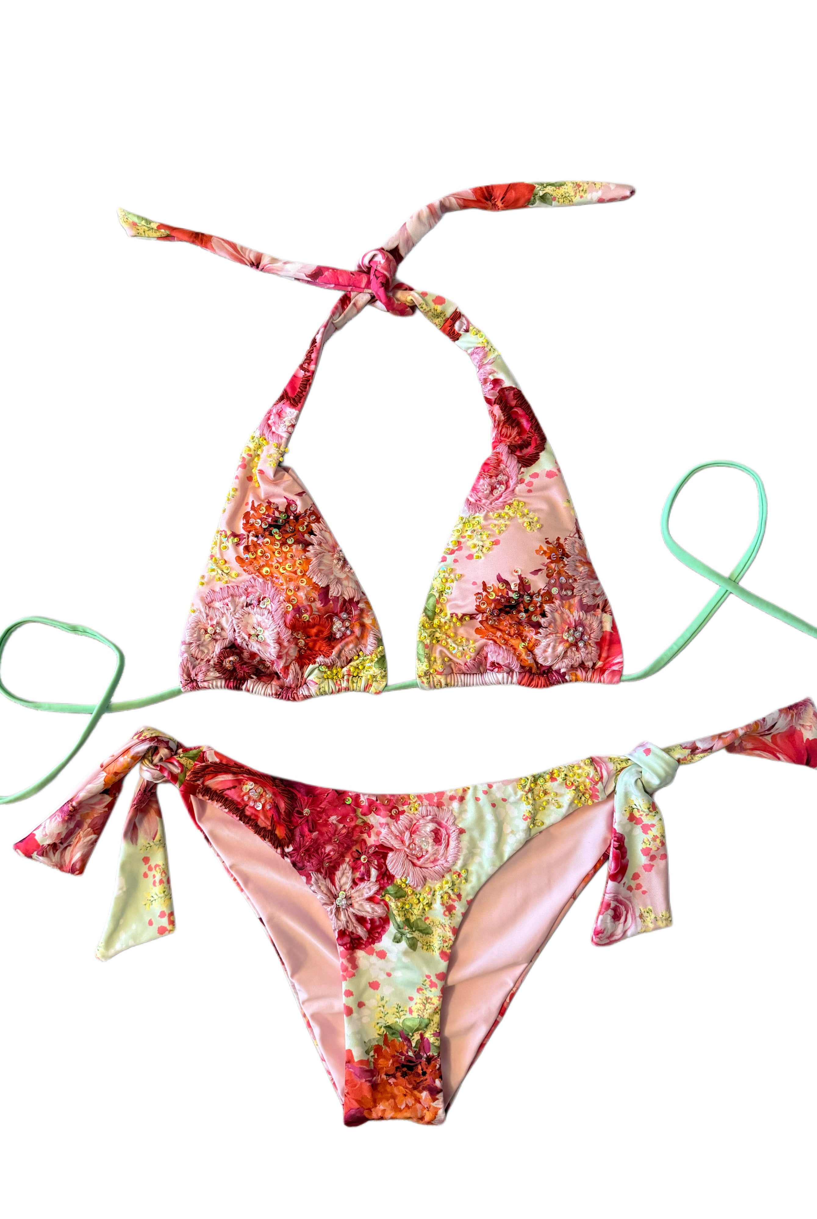 The Diana Bikini Set, is fully embellished with handcrafted beading for a luxurious, artisanal feel. The adjustable triangle slider top ensures a perfect fit; the bottom features side ties.