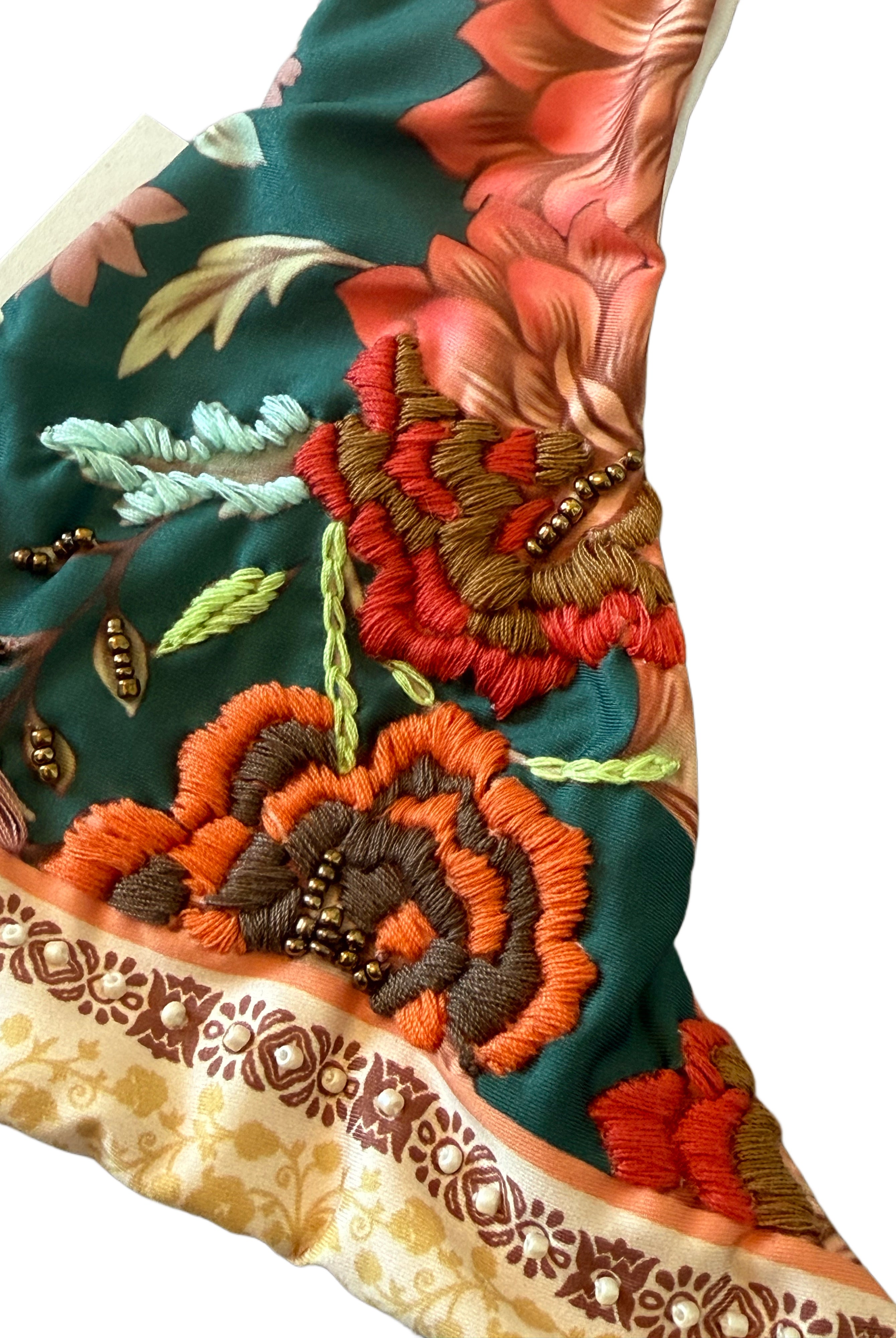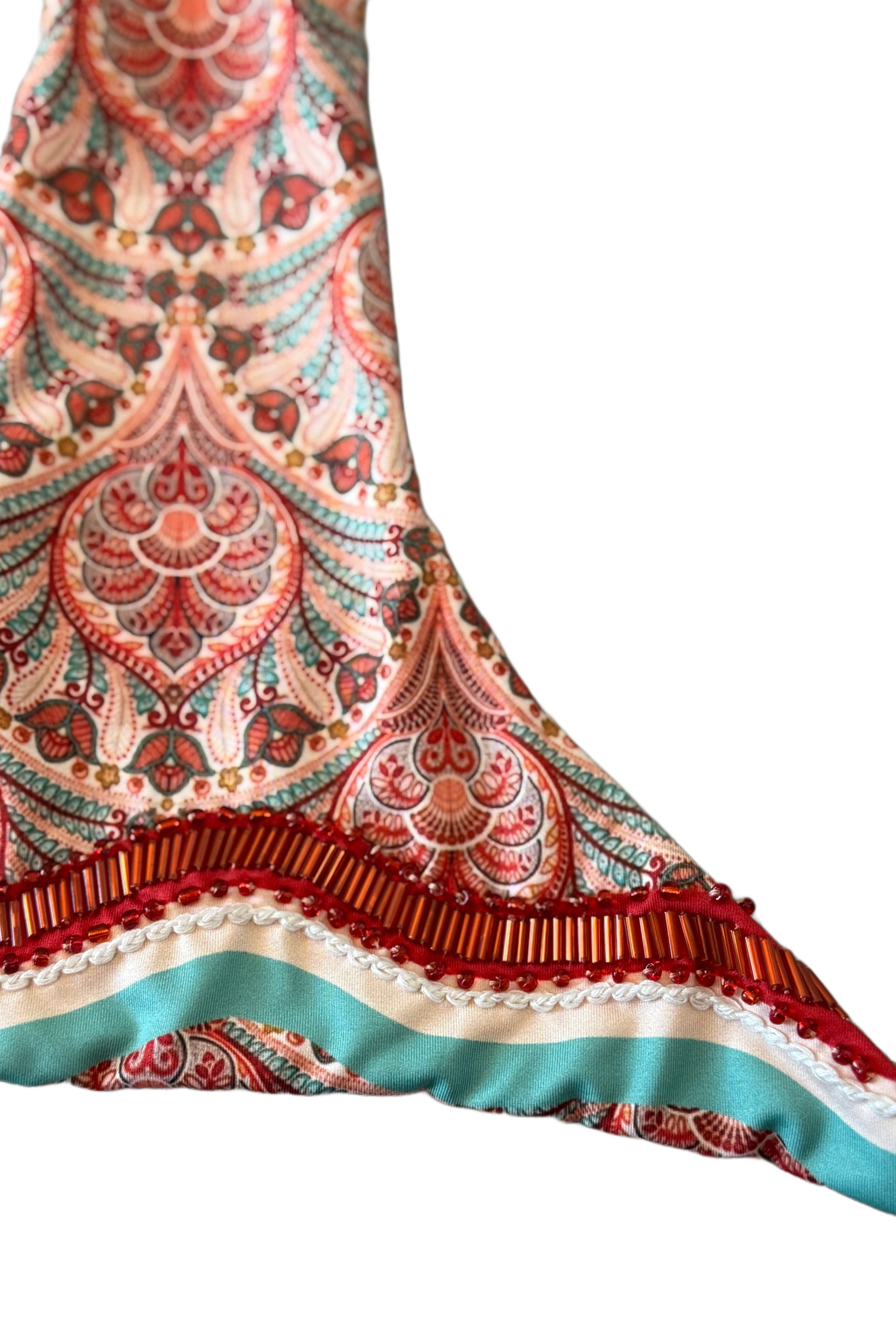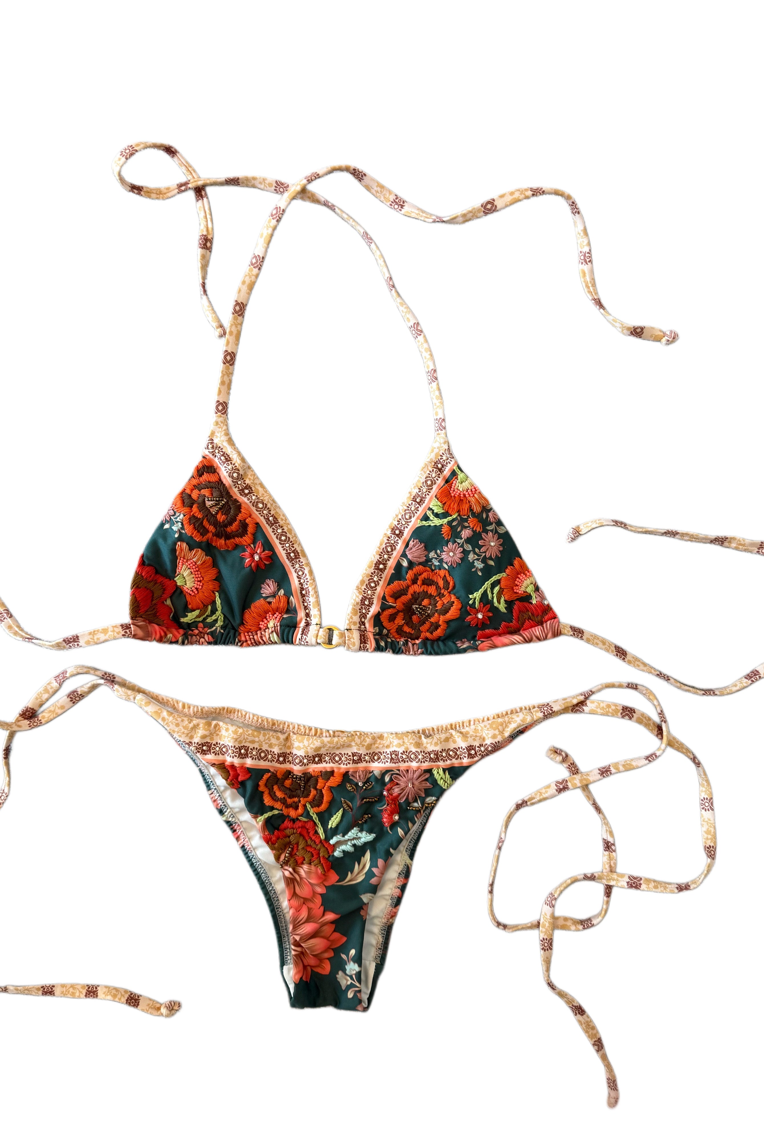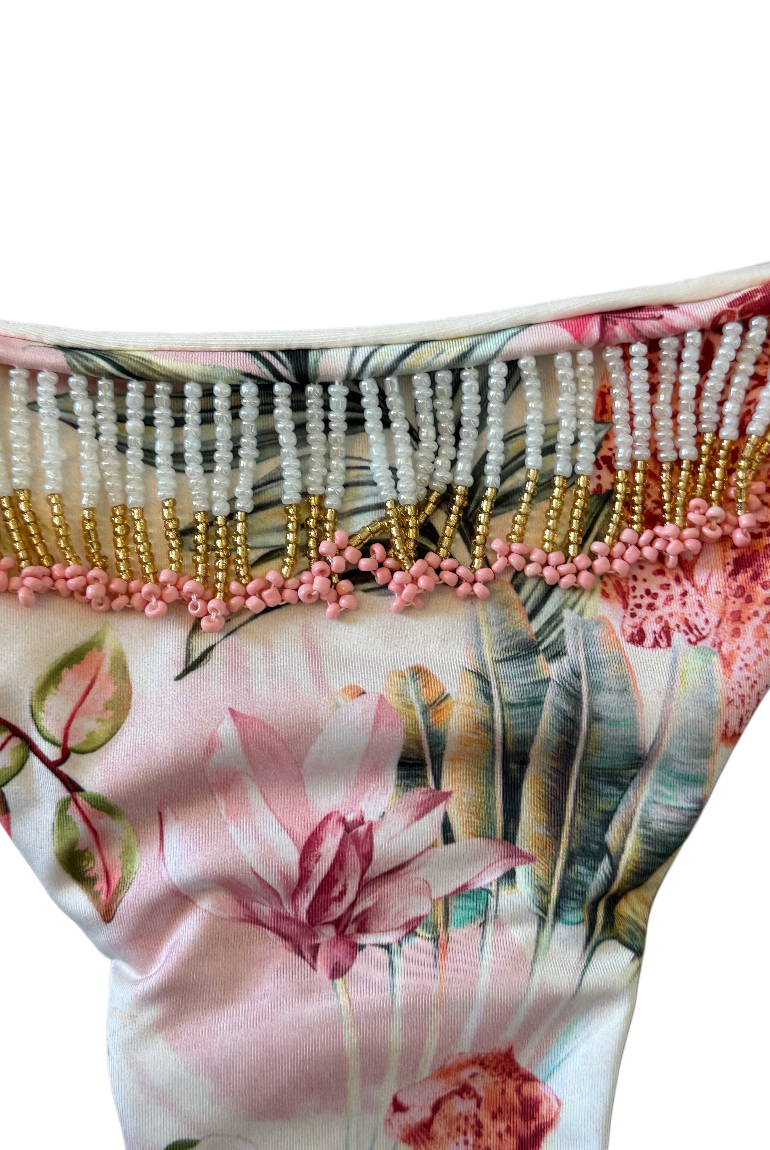 The Diana Bikini Set, is fully embellished with handcrafted beading for a luxurious, artisanal feel. The adjustable triangle slider top ensures a perfect fit; the bottom features side ties.